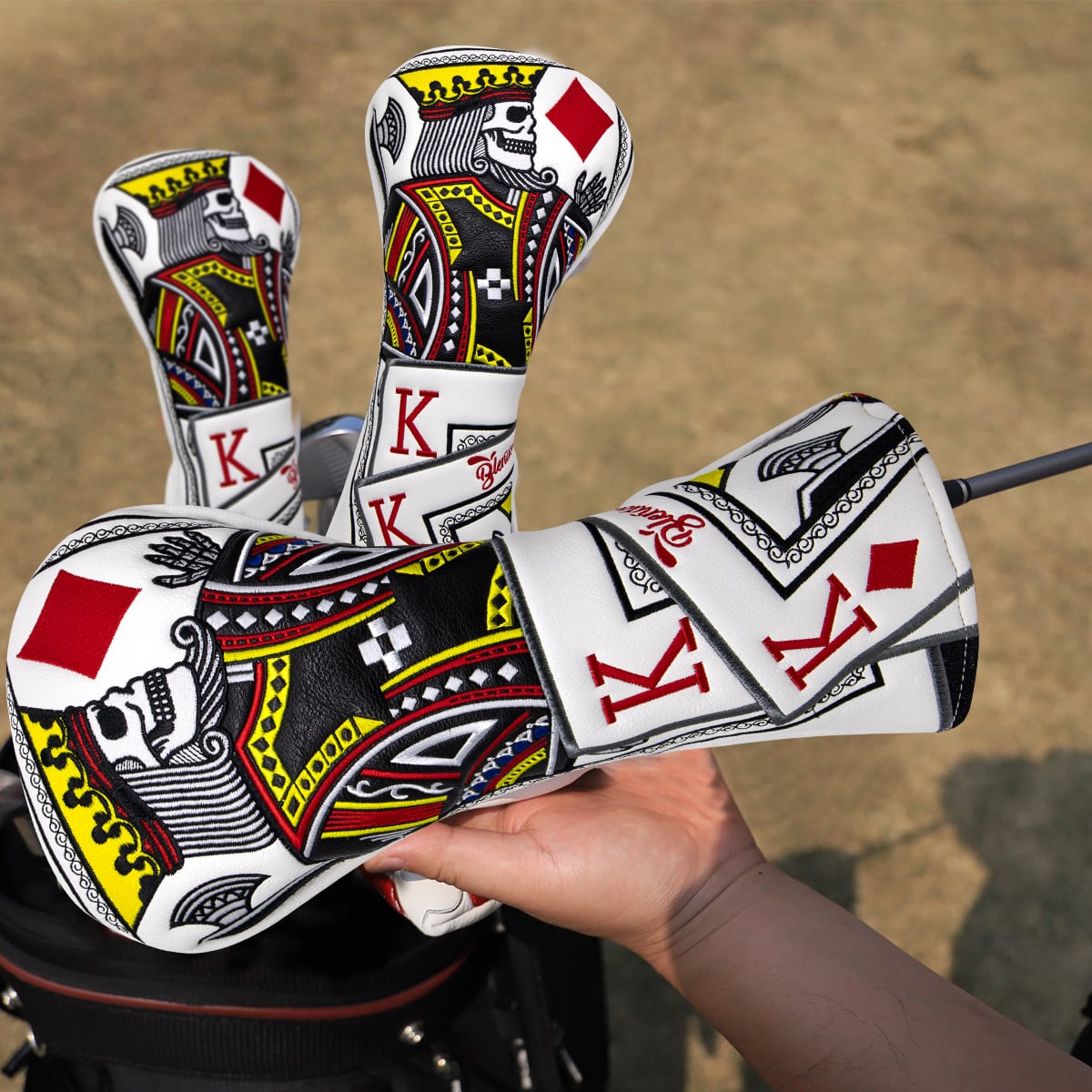 トランプのキングをモチーフにした刺繍デザインのゴルフヘッドカバーセット。